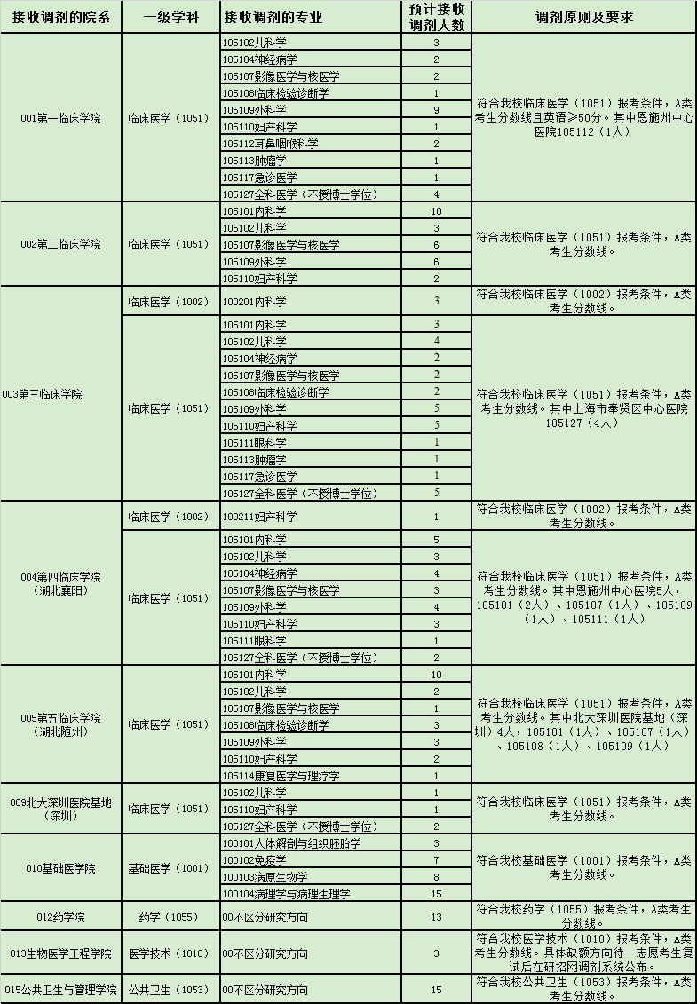 4.初试科目与调入专业初试科目相同或相近,其中统考科目原则上应相同。其中临床医学(1051)要求初试专业课必须为西医综合(科目代码306),护理(1054)要求初试专业课必须为护理综合(代码308)。