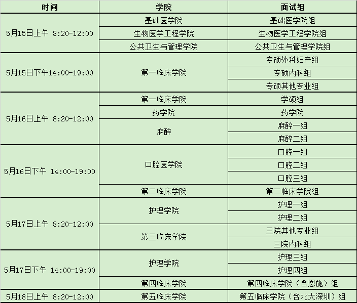 根据《湖北医药学院2020年硕士研究生复试工作方案》,为严格落实疫情防控工作要求,遵循错时错峰工作要求,各学院或学科分时、分批有序安排。根据网络面试系统的功能特点,现公布各学院(学科)一志愿报考我校的考生复试时间安排,请考生提前做好准备,协调好参加复试的时间。
