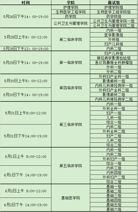 根据《湖北医药学院2020年硕士研究生复试工作方案》,为严格落实疫情防控工作要求,遵循错时错峰工作要求,各学院或学科分时、分批有序安排。根据网络面试系统的功能特点,现公布调剂报考我校的考生复试时间安排,请考生提前做好准备,按时参加各学院的模拟测试,协调好参加复试的时间,保持通讯方式畅通。