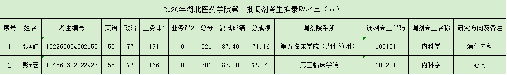 根据《2020年全国硕士研究生招生工作管理规定》(教学〔2019〕6号)和湖北省招办的有关文件精神,经过学校研究生教育工作领导小组讨论,现将第一批调剂考生拟录取补录名单予以公示(共2人),公示期6月8日-6月19日,接受广大考生和社会的监督。联系电话:0719-8878051;举报电话:0719-8891077(纪委)。