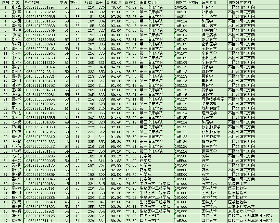 2021年湖北医药学院第一批调剂考生拟录取名单含考试成绩(一)
