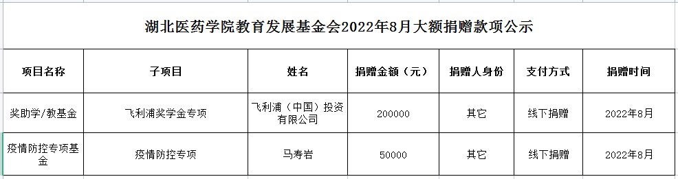 湖北医药学院教育发展基金会2022年8月大额捐赠款项公示