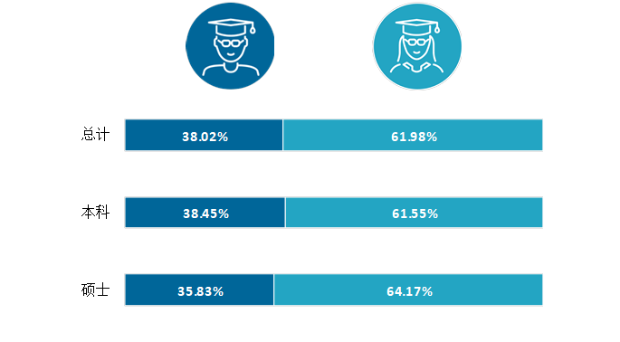从性别结构来看,男生占38.02%;女生占61.98%,整体男女比为1:1.63。具体分学历层次来看,本科毕业生中,男生占38.45%,女生占61.55%,男女比为1:1.60;硕士毕业生中,男生占35.83%,女生占64.17%,男女比为1:1.79。