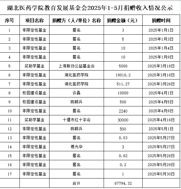 教育发展基金会2025年1-5月捐赠收入情况公示